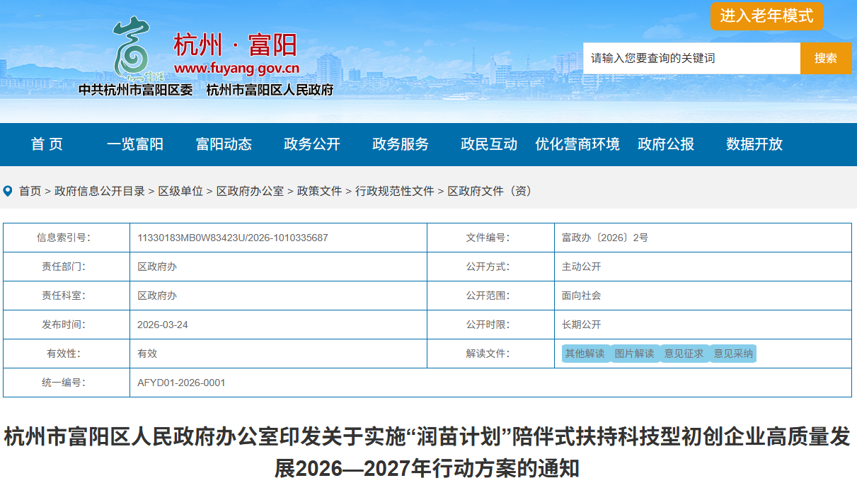 杭州市富阳区人民政府办公室印发关于实施“润苗计划”陪伴式扶持科技型初创企业高质量发展2026—2027年行动方案的通知